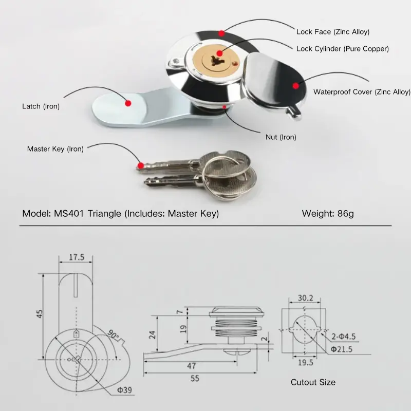 The lock face has a diameter of 39mm, and the waterproof cover rotates 90°.